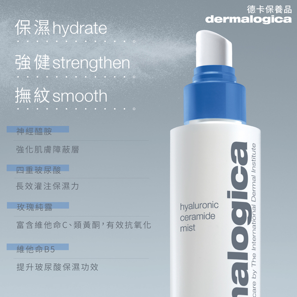 一款含神經醯胺及四重玻尿酸持久保濕噴霧!全天候持續灌注肌底水分,並特別添加玫瑰醇露,使肌膚充滿彈性外又煥發活力光彩。